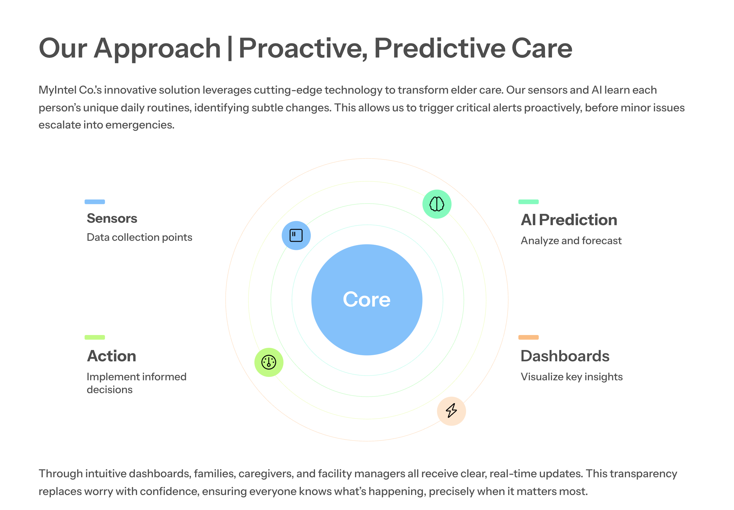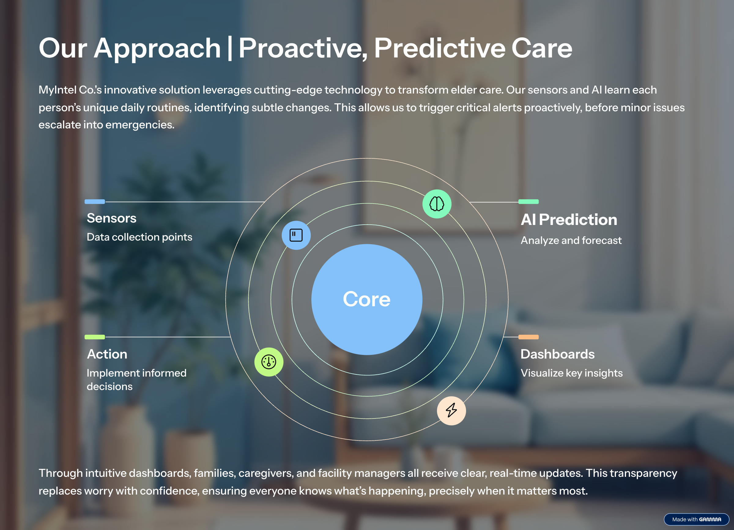 MyIntel combines privacy-first sensors with routine-learning AI to deliver calm, clear updates - no cameras, no wearables. Ideal for homes and senior living facilities.